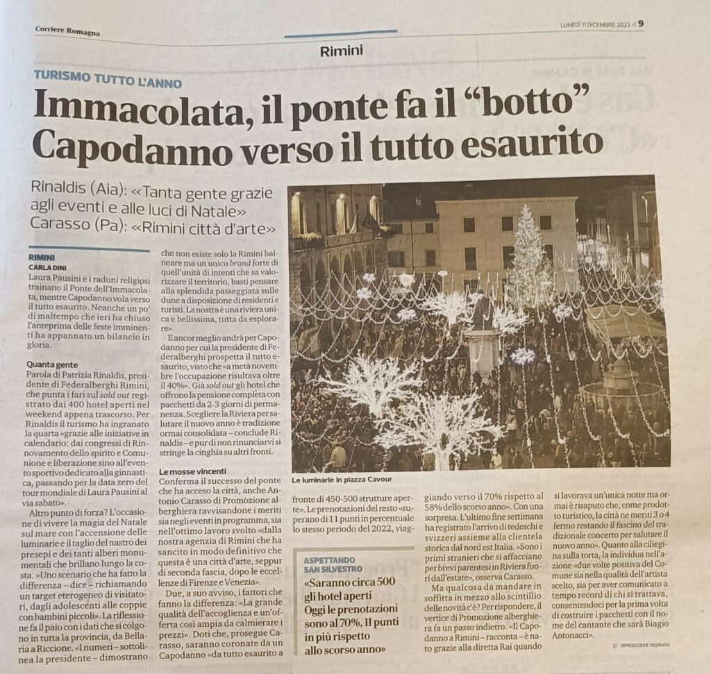 Articolo del 9 dicembre. 11 Dicembre 2023 Condividi Facebook Email leonardo Articoli Correlati Rassegna stampa Prezzi pazzi in Hotel Leggi l'articolo Rassegna stampa No allo scippo del personale. Clicca sul titolo per leggere l'articolo della Presidente Patrizia Rinaldis. Rassegna stampa Federalberghi: Pasqua in Hotel con riscaldamento.